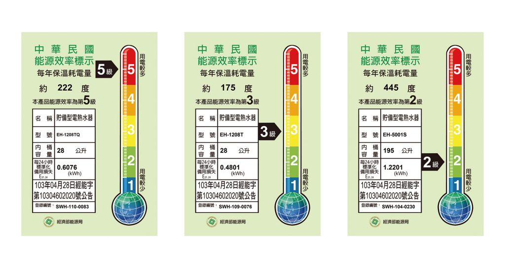選擇能源效率較高的熱水器可以節省能源和費用。能源效率是指熱水器將瓦斯或電能轉換為熱能的效率。能源效率較高的熱水器可以在相同的時間內使用更少的能源,從而節省費用,政府訂定能源效率標章,從5級至1級,越接近能源效率1級代表越節能。